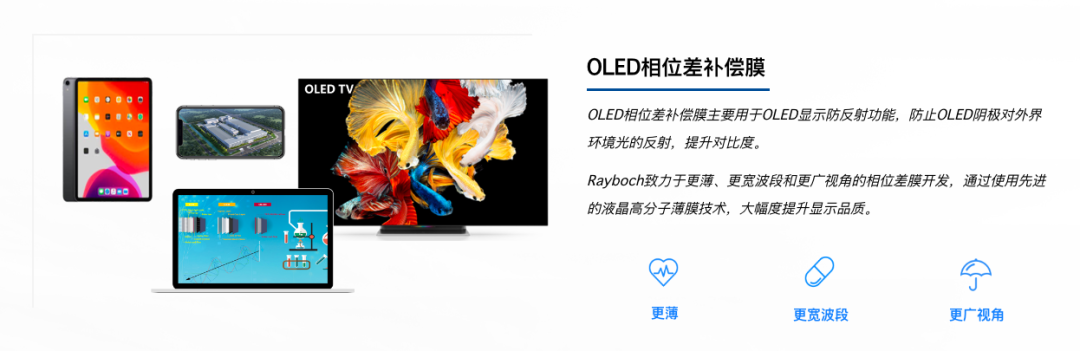 OLED相位差补偿膜主要用于OLED显示防反射功能,防止OLED阴极对外界环境光的反射,提升对比度。Rayboch致力于更薄、更宽波段和更广视角的相位差膜开发,通过使用先进的液晶高分子薄膜技术,大幅度提升显示品质。