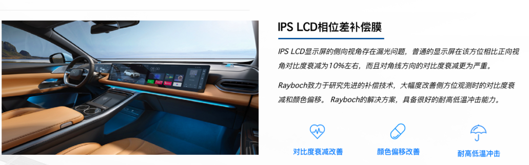 而瑞波科光电致力于研究先进的补偿技术,大幅度改善侧方位观测时的对比度衰减和颜色偏移。Rayboch的解决方案,具备很好的耐高低温冲击能力。