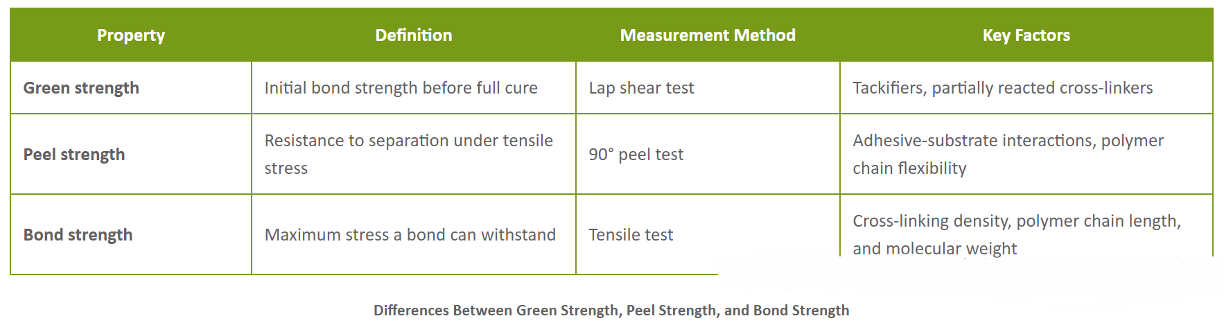 理解粘合剂强度指标,如绿强度、剥离强度粘结强度,对于选择合适的粘合剂至关重要。一种全面的方法,平衡技术指标与化学成分,确保了最佳性能。通过考虑固化剂、联密度和基底相互作用等因素,配方设计师可以为各种应用创造耐用且可靠的粘合剂解决方案。下表总结了绿强度、剥离强度粘结强度之间的差异。
