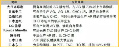 虽然多家企业,包括光板TAC膜生产商、涂布企业以及偏光片生产企业,都具备一定的TAC膜表面处理能力,但它们在技术上各自有所长。例如,大日本印刷在高清防眩AG膜领域处于领先地位,占据了超过70%的市场份额;而凸版印刷和日本造纸则以其CHC处理技术闻名,同时,凸版印刷还是干法生产AR膜的佼佼者。