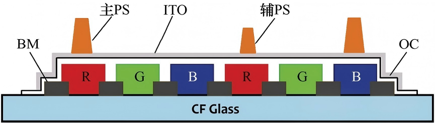 针对上面所提到的两种彩斑不良现象,其产生机理通过如下原理性阐述进行详细说明,在讲原理之前,我们先记住下面这张图3 CF 侧的结构,方便后面理解。