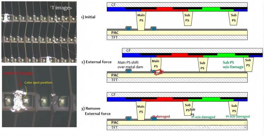 关键在于:当LCD显示面板受到的外力相对较小,Main PS发生形变的形变量<Main PS与Sub PS的断差,也就是说只有Main PS有划伤PI,Sub Main 没有划伤PI,这种情况下会出现单色彩斑。至于是什么颜色的彩斑,取决于面板受力变形后Main PS滑动的方向,下图4单色彩斑产生机理示意图。