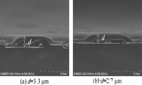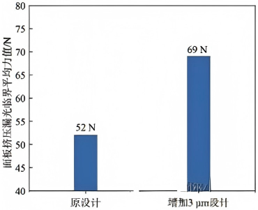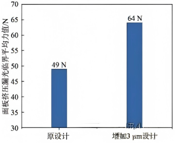在满足液晶面板光学特性的前提下,通过增加PS的尺寸使之与配向膜接触面变大,相同负载下PS受到的压强变小,形变量减小,因此压缩后产生的塑性形变减小,挤压出现彩斑的平均临界力值增大(如下图7所示,增加3um出现彩斑的临界压力数据对比),能够清晰的看出,PS 直径的增加能够有效改善挤压彩斑不良。