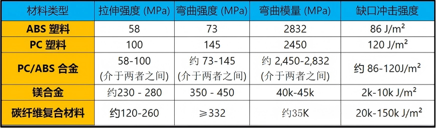 在满足设计要求的前提下,选择强度更高的机构件材料(特别是A件),最大限度地降低可靠性测试过程中对LCD的挤压力,以提供最强的支撑和保护。如下表1 列举了常见A壳常见材料及其强度数据,涵盖ABS塑料、PC塑料、PC/ABS合金、镁合金和碳纤维复合材料这几种主流材料: