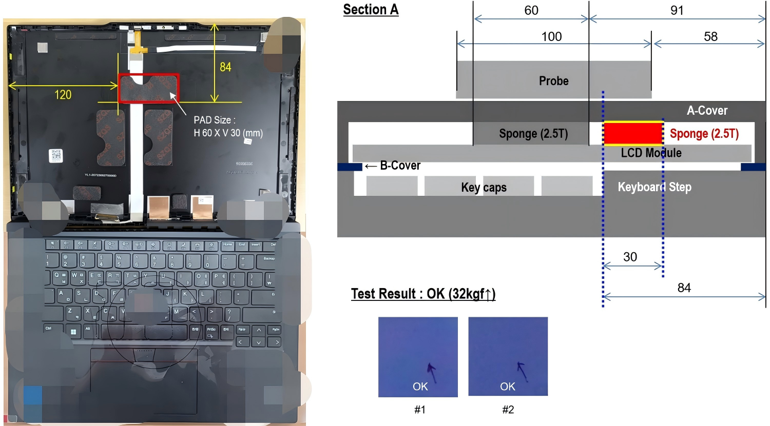 l 分散应力:优化C件(键盘面)接触形状、在A件与屏幕间预留缓冲间隙、精准设计泡棉的位置与材质以分散压力。