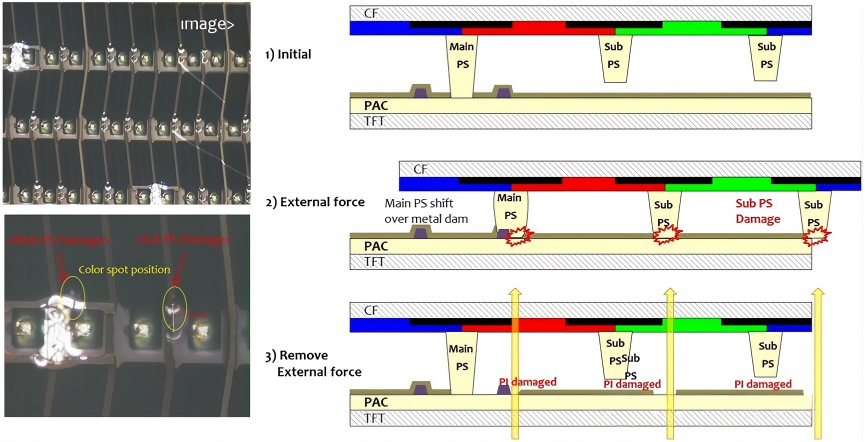 关键在于:当LCD显示面板受到的外力相对较小,Main PS发生形变的形变量<Main PS与Sub PS的断差,也就是说只有Main PS有划伤PI,Sub Main 没有划伤PI,这种情况下会出现单色彩斑。至于是什么颜色的彩斑,取决于面板受力变形后Main PS滑动的方向,下图4单色彩斑产生机理示意图。