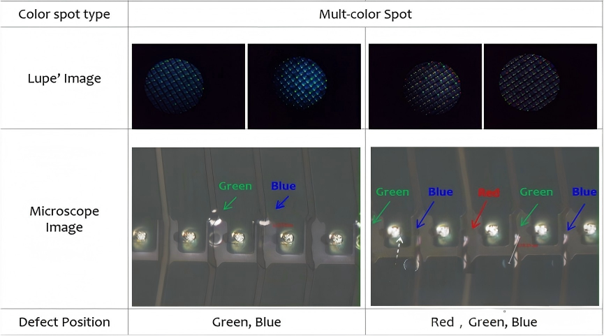 2.彩斑不良现象:按照LCD彩斑的颜色/种类数量来进行分类,整机可靠性测试中出现的彩斑有单色彩斑和多色彩斑。
