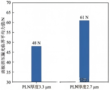 PLN为有机膜层,主要起平坦化作用使配向更均匀,同时减小耦合电容,并对下基板的TFT电场进行屏蔽,避免影响同一基板上的像素电容,防止电场相互干扰。参考右下侧针对不同PLN厚度的产品挤压实验,PLN 厚度为d=3.3μm的液晶面板出现彩斑平均临界值为48 N,而d=2.7μm的平均临界力值为 61 N,图11 和图12 。
