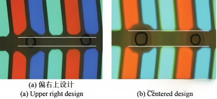 液晶面板内PS站位调整为整体居中设计,挤压后偏移距离小,不易出现挤压漏光。参考如下右侧PS不同占位(偏右上 vs居中)出现彩斑的临界压力数据对比数据,图9与图10。