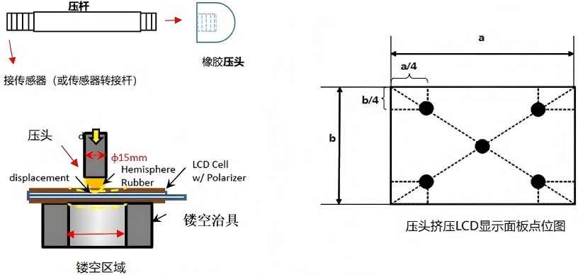 目前,屏厂家和终端客户针对LCD的抗挤压能力也有各种测试及监控手段,目的是为了能够评估单体的抗压力状况,而不是等到组装上整机后才能知道是否满足整机的压力测试要求。通过定义一些方法对LCD显示面板进行挤压,提前评估LCD抵抗红蓝斑发生的能力,例如下面图13示所定义的其中一种方法: